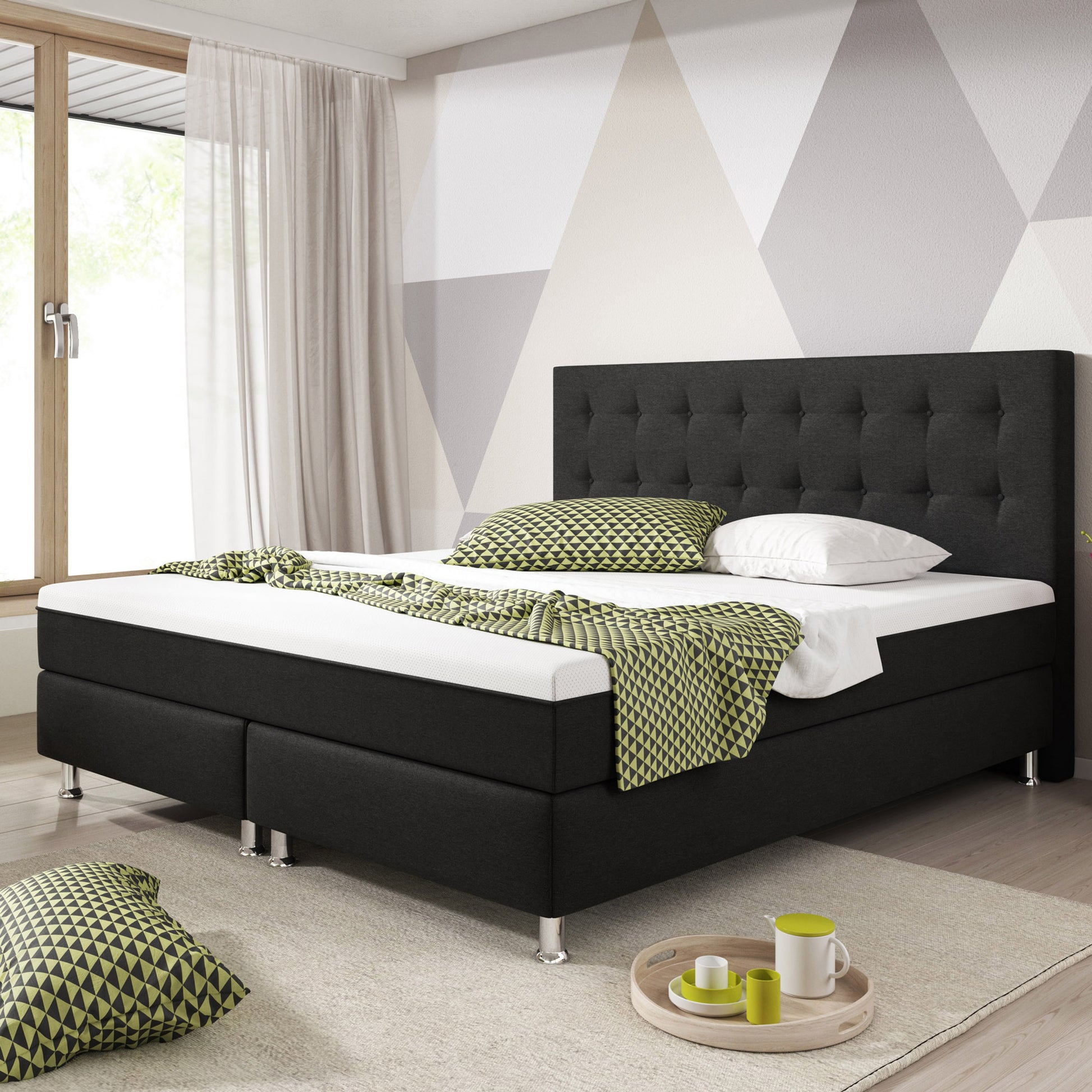 Boxspringbett Köln Plus 180x200 cm Webstoff Schwarz mit Topper-Optik